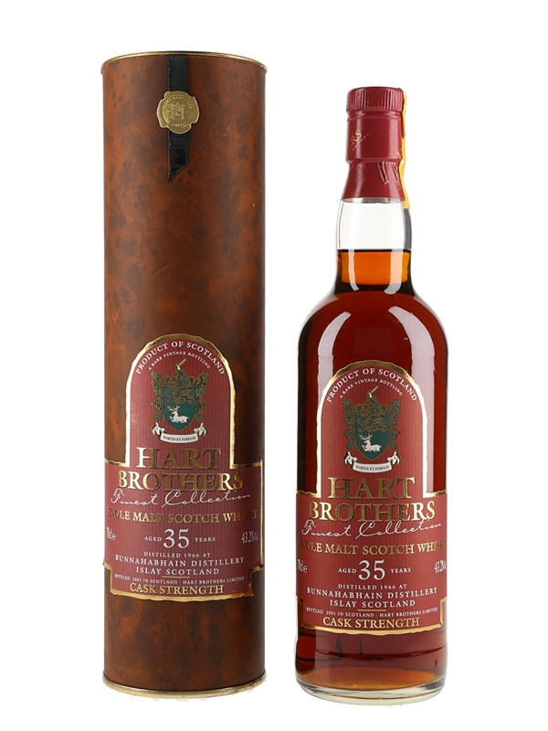 A bottle of Bunnahabhain 35 Year Old Single Malt Scotch Whisky. This was distilled in 1966 matured for 35 years and bottled at a cask strength of 43.2% ABV in 2001 by Hart Brothers.