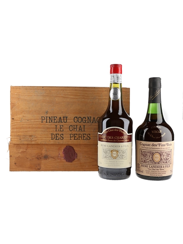 This lot contains two bottles produced by Remi Landier & Fils including, Cognac Des Fins Bois VSOP and Pineau Des Charentes presented in a wooden box.