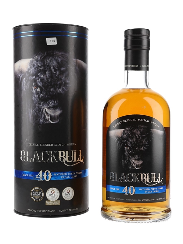 A bottle of Black Bull 40 Year Old Deluxe Blended Scotch Whisky, bottled in November 2009. The label reads 'cask strength, non-chill filtered, non-coloured, entirely natural. Single Malt 90% Single Grain 10%'.