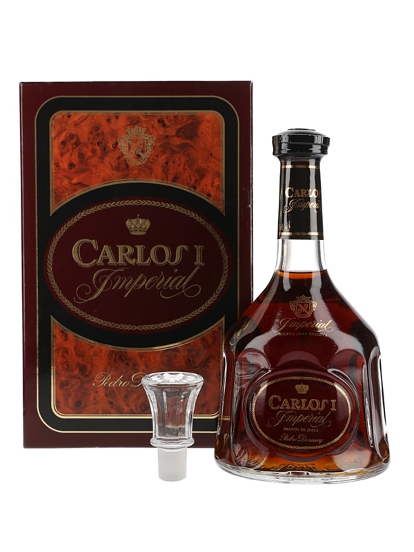 A bottle of Carlos I Imperial Brandy de Jerez from Pedro Domecq. This comes in a presentation box with stopper.