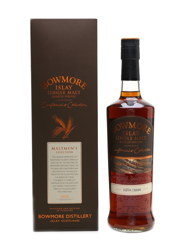 A bottle of Bowmore 13 Year Old Maltmen's Selection. The casks for this bottling were selected by Bowmore's four maltmen, five sherry butts were chosen for their individual character before marrying together and bottling at cask strength.