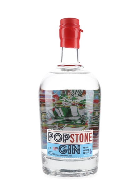 A bottle of Pop Stone Dry Gin bottled and distilled at Salty Stone distillery in Serbia. This is bottle number 181; it was bottled from batch number 5.