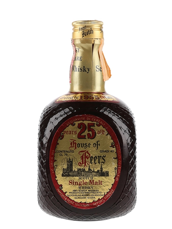 A bottle of House Of Peers 25 Year Old Single Malt Scotch whisky, distilled in 1955, bottled by Douglas Laing & Co. Ltd. We estimate this was bottled in the 1980s.
