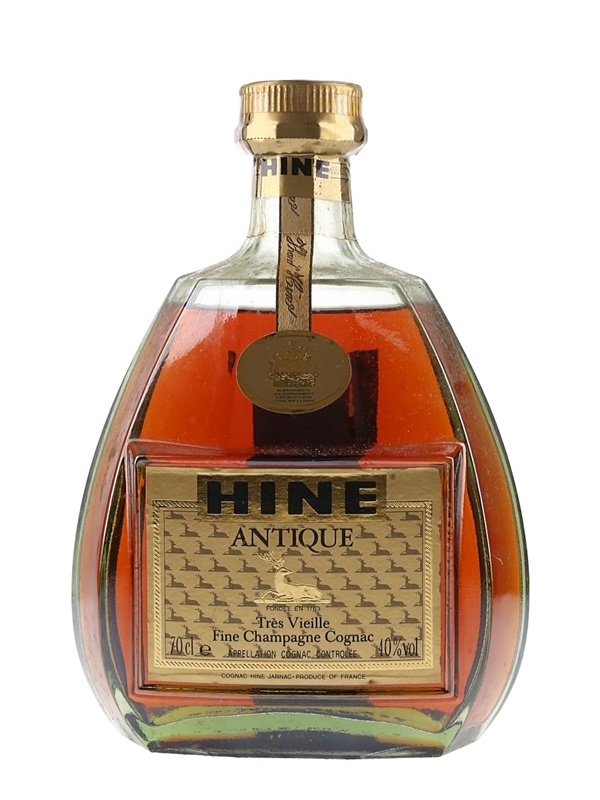 A bottle of Hine Antique Très Vieille Fine Champagne Cognac. We estimate this was bottled in the 1980s to 1990s.
