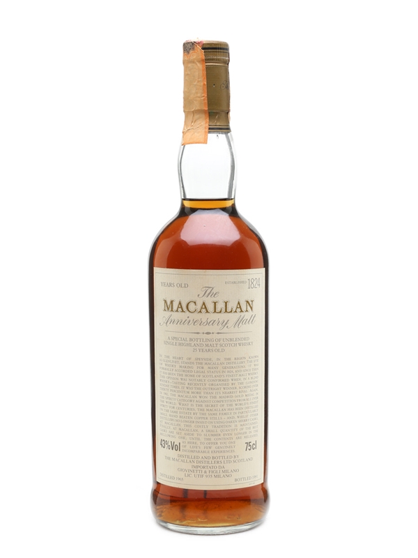 A bottle of The Macallan 25 Year Old, distilled in 1965 and bottled in 1991 for the Anniversary Malt series.