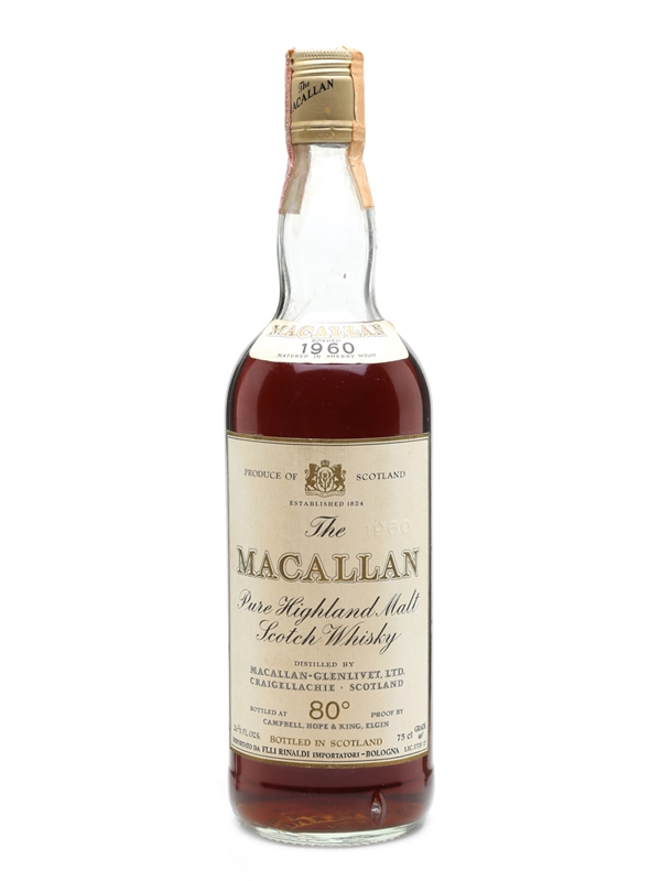 A bottle of The Macallan 1960, bottled by Campbell, Hope & King. This was bottled for the Italian market and imported by Rinaldi, we estimate in the 1970s.