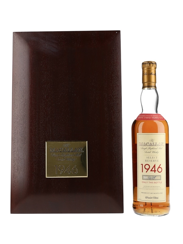 A bottle of The Macallan 1946 52 Year Old Select Reserve Single Highland Malt Scotch Whisky. This was distilled in 1946, matured for 52 years in sherry casks and is presented in a handmade wooden case. This comes with a certificate of guarantee signed by the distillery manager and dated 1 May 1998.