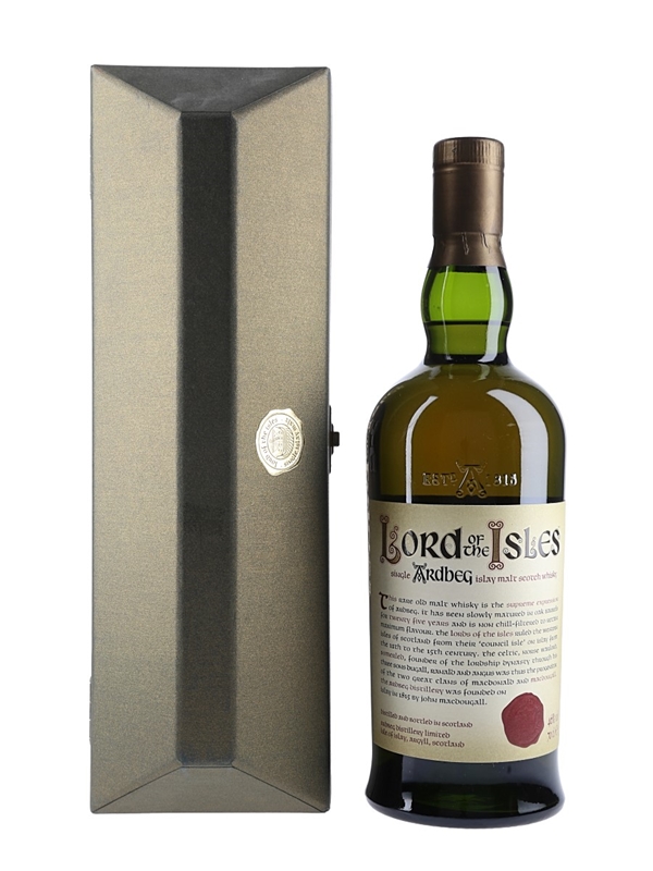 A bottle of Ardbeg Lord of the Isles Single Ardbeg Islay Malt Scotch Whisky, matured for 25 years and bottled at 46% ABV. It was first launched in 2001 and production continued until 2007. This is presented with a scroll telling the story of Somerled, a Celtic-Norse warlord and the first Lord of the Isles.
