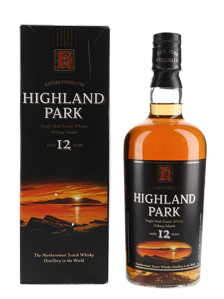 A bottle of Highland Park 12 Year Old Single Malt Scotch Whisky from the Orkney Islands. We estimate this was bottled in the 2000s.