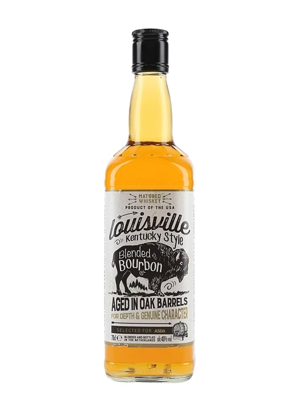 A bottle of Louisville Kentucky Style Blended Bourbon produced in the USA and blended and bottled in the Netherlands for UK supermarket store Asda.