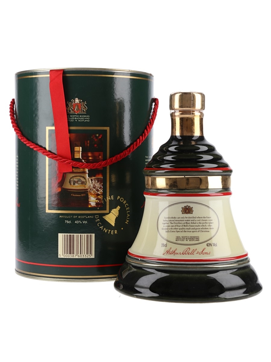 A bottle of Bell's Old Scotch Whisky presented in a porcelain Wade decanter and released for Christmas 1990. The label depicts 'The Art of Distilling' with Blair Athol distillery blanketed in snow.