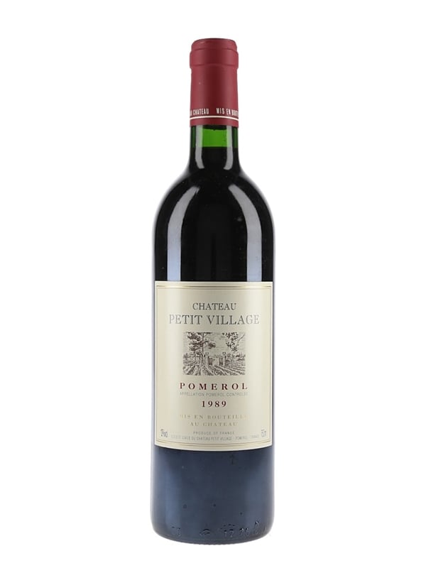 A bottle of Château Petit Village 1989 from Pomerol, an 11 hectare estate planted with 75% Merlot, 17% Cabernet Sauvignon, and 8% Cabernet Franc. Production is around 55,000 bottles per year.