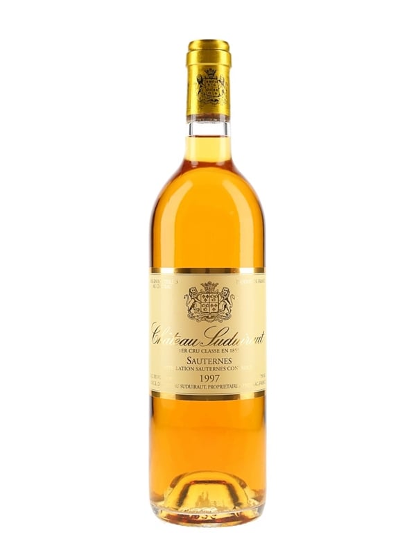 A bottle of 1997 Château Suduiraut from Sauternes. Suduiraut is one of the grandest Châteaux in Bordeaux, and the vineyards are planted with 90% Sémillon and 10% Sauvignon Blanc.