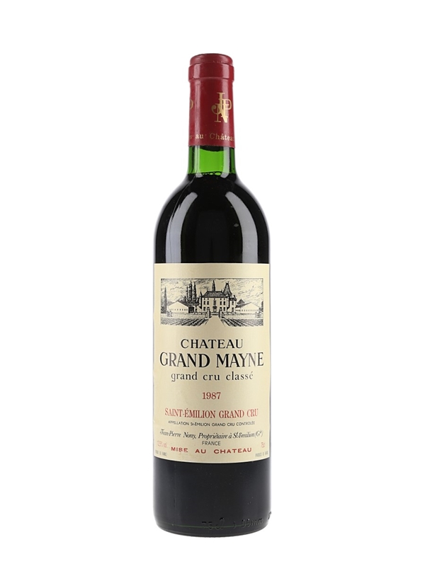 A bottle of Château Grand Mayne 1987, Grand Cru classé wine from the Saint-Emilion appellation. The estate is planted with 80% Merlot and 20% Cabernet Franc, and produces around 48000 bottle a year.