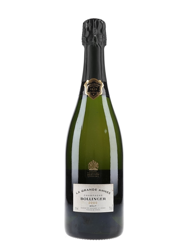 A bottle of Bollinger 2000 La Grande Année Champagne, a blend of 63% Pinot Noir and 37% Chardonnay sourced from 76% Grand Cru and 34% Premier Cru vineyards, with all base wines aged in old oak, and all riddling and disgorged by hand.