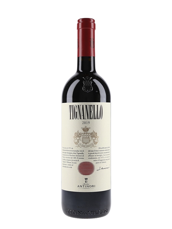 A bottle of 2019 Antinori Tignanello, a Tuscan blend consisting largely of Sangiovese with a small amount of Cabernet Sauvignon and Cabernet Franc in this vintage.