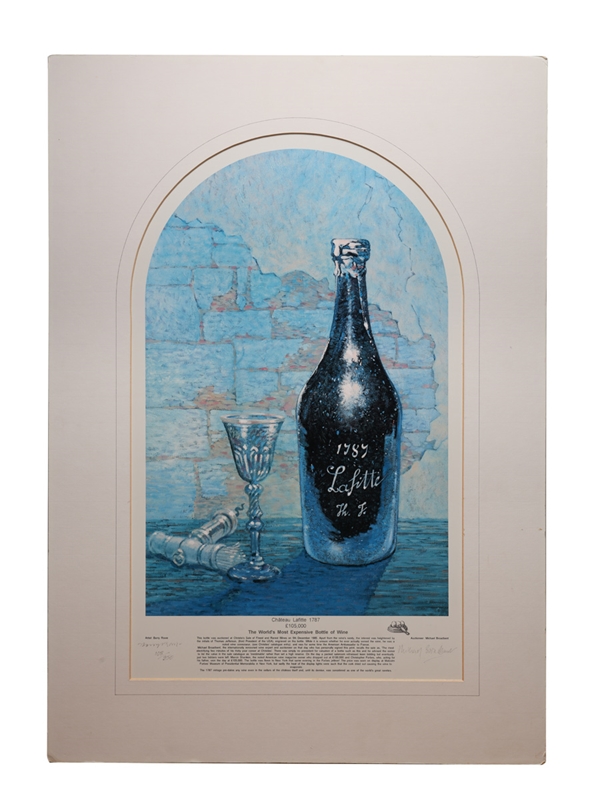 A cardboard backed limited edition print by artist Barry Rowe picturing a bottle of Château Lafitte 1787, sold by the late Michael Broadbent, Master of Wine and Christie's auctioneer, on 5 December 1985 for a then record breaking sum of £105,000 to American millionaire Malcolm Forbes. This is print number 108 of 850, and comes with a copy of original Christie's catalogue entry for the wine.