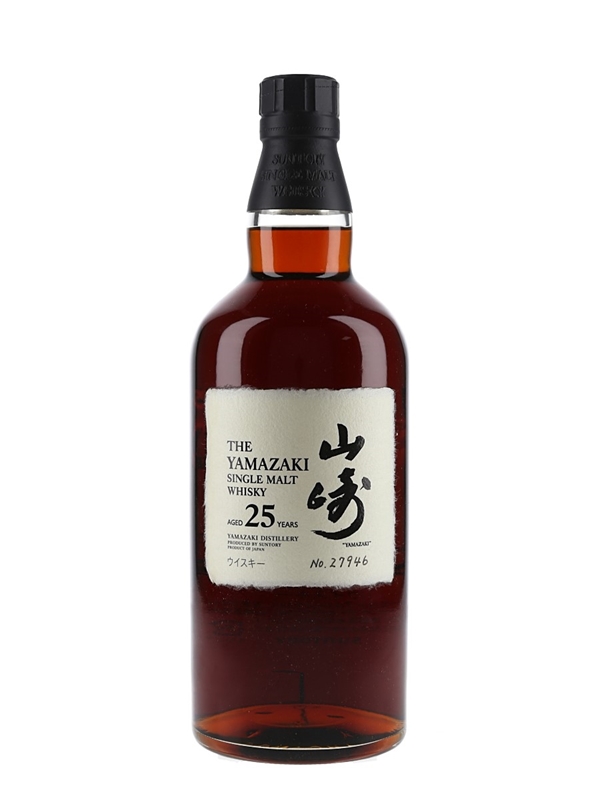 A bottle of The Yamazaki 25 Year Old Single Malt Whisky from Japan, matured in sherry casks. This is bottle number 27946.