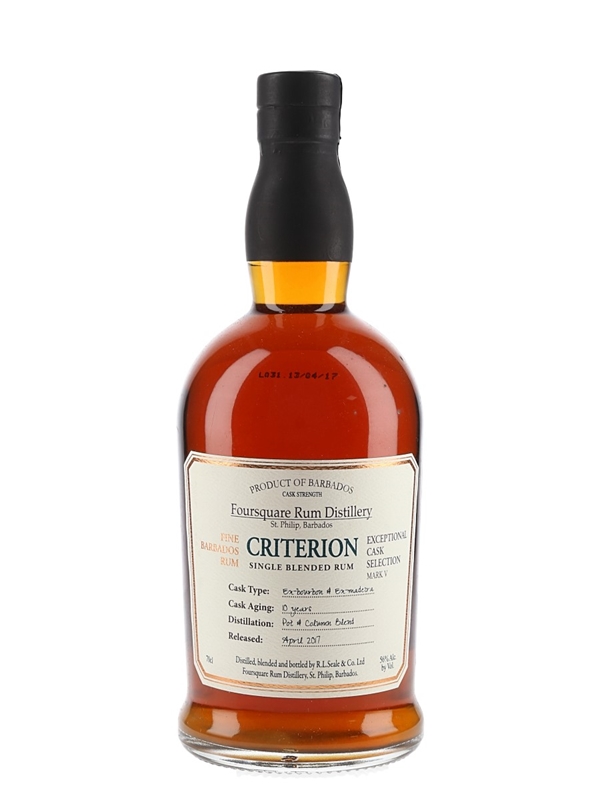 A bottle of Foursquare Criterion 10 Year Old Cask Strength Single Blended Fine Rum from Barbados. This is a blend of pot still and twin column continuous distillate, matured in ex-bourbon & ex-Madeira casks for 10 years and released in April 2017 as part of the Exceptional Cask Selection series.