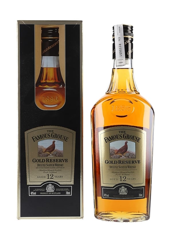 A bottle of The Famous Grouse 12 Year Old Gold Reserve, created to celebrate the centenary of the brand. This is made with a high proportion of malt whiskies, including The Macallan and Highland Park.