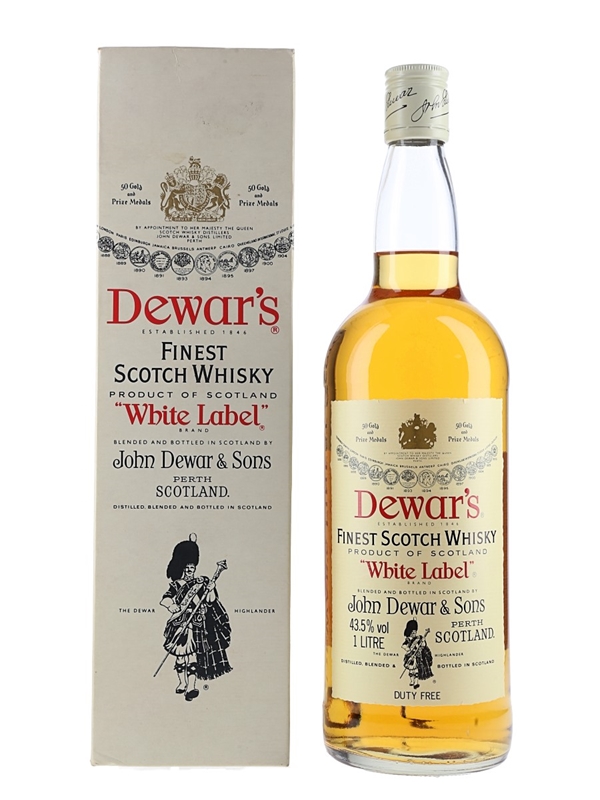A litre bottle of Dewar's White Label Finest Scotch Whisky. We estimate this was bottled in the 1980s.