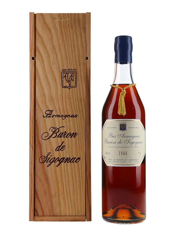 A bottle of Baron de Sigognac 1944 Bas Armagnac. This was matured in oak casks and bottled on 19 November 2003. It comes in a wooden presentation box.