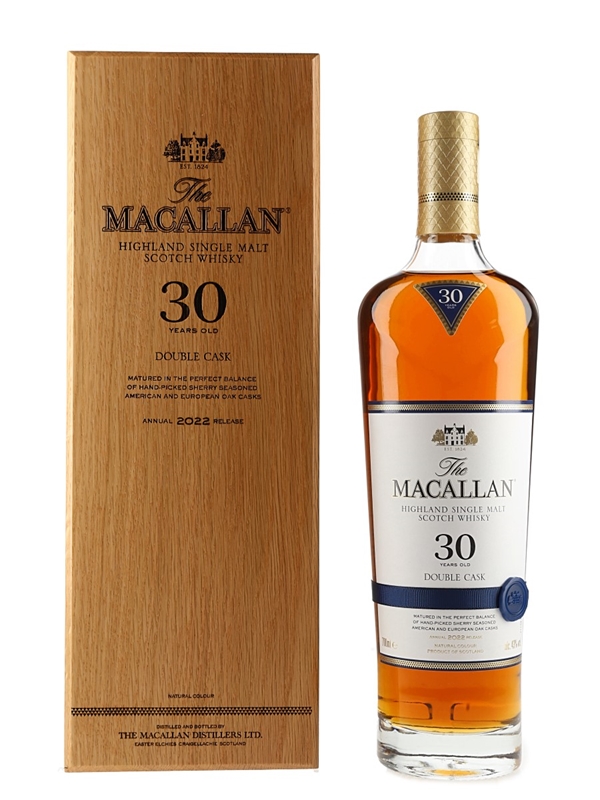 A bottle of The Macallan 30 Year Old Double Cask Highland Single Malt Scotch Whisky. This was matured in a combination of sherry seasoned American and European oak casks and bottled for the annual release in 2022.