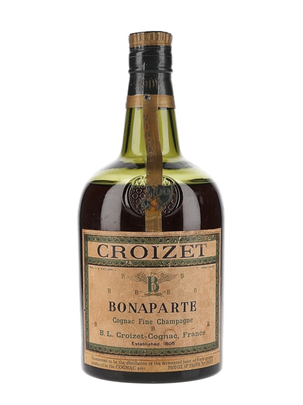 A bottle of 1906 Croizet Bonaparte Fine Champagne Cognac. We estimate this was bottled in the 1960s.