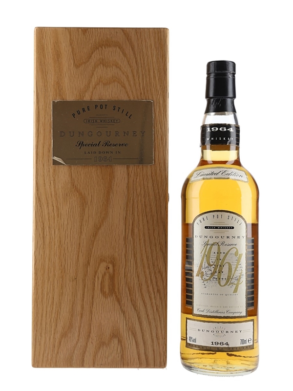 A limited edition bottle of Dungourney 1964 30 Year Old Special Reserve Pure Pot Still Irish whiskey, distilled, matured and bottled by Cork Distilleries Company. This comes in a wooden presentation box.