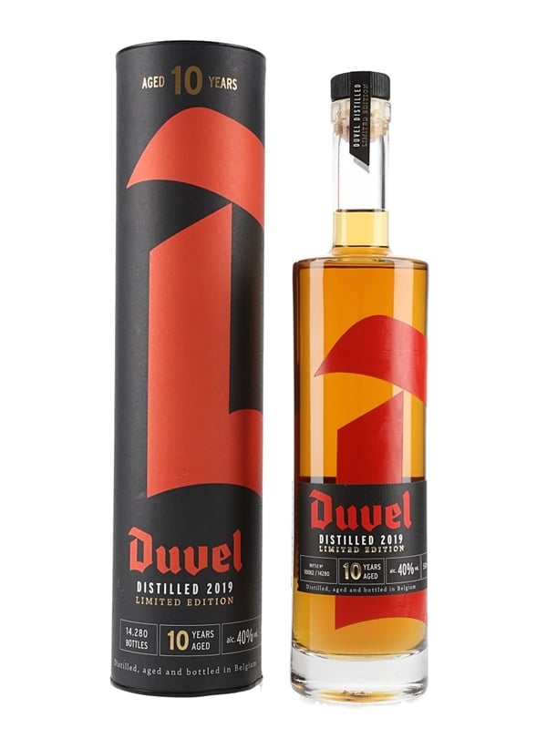 A limited edition 50cl bottle of Distilled Duvel 2019 10 Year Old. This is a distilled Duvel beer from Belgium, brewed in the traditional way and then distilled. This was matured for 10 years in bourbon and sherry casks and bottled at 40% ABV.