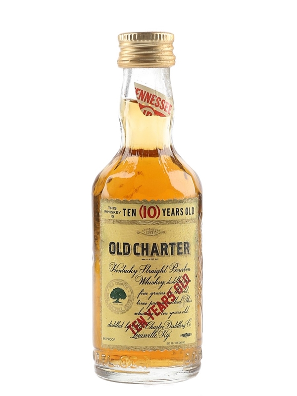 A miniature bottle of Old Charter 10 Year Old Kentucky Straight Bourbon Whiskey distilled by Old Charter Distillery Co., Louisville, Ky. We estimate this was bottled in the 1970s.