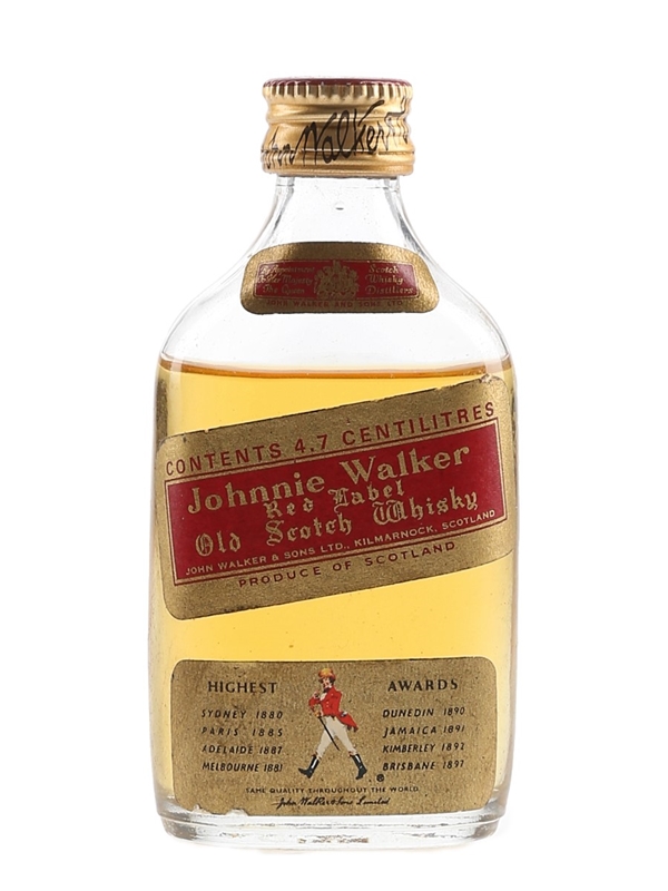 A 4.7cl miniature bottle of Johnnie Walker Red Label Old Scotch Whisky, the world's best selling Scotch whisky produced by John Walker & Sons Ltd. We estimate this was bottled in the 1980s.