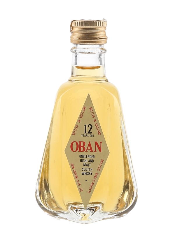 A miniature bottle of Oban 12 Year Old Unblended Highland Malt Scotch Whisky produced by John Hopkins & Co Ltd. We estimate this was bottled in the 1980s.