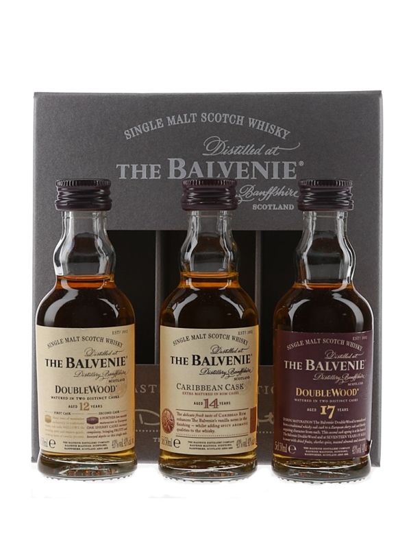 The Balvenie Tasting Collection contains three miniature bottles including Balvenie 12 Year Old Doublewood, Balvenie 14 Year Old Caribbean Cask and Balvenie 17 Year Old Doublewood.