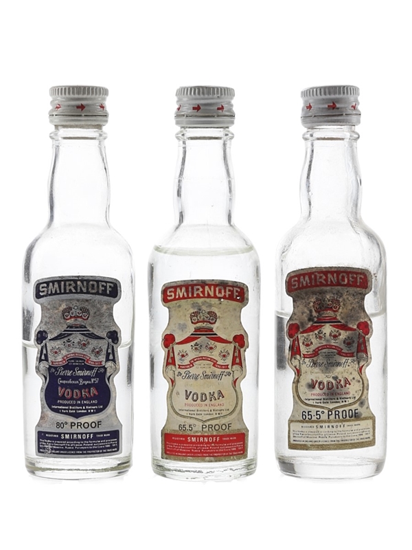 This lot contains three miniature bottles of Smirnoff Vodka produced in England, including Blue and Red Label. We estimate these were bottled in the 1960s to 1970s.