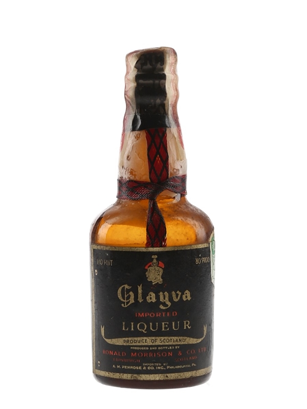 A miniature bottle of Glayva Scotch whisky liqueur, produced by Ronald Morrison & Co. Ltd. We estimate this was bottled in the 1950s.
