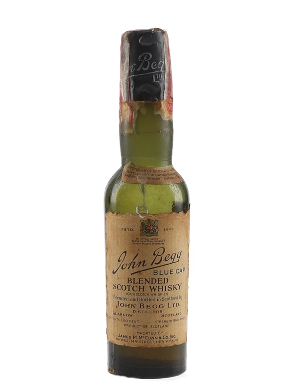 A miniature bottle John Begg Blue Cap Blended Scotch Whisky. This was bottled for US importer James M McCunn & Co., we estimate in the 1950s.