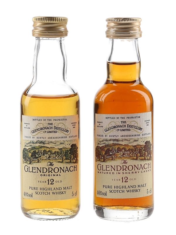 This lot contains two miniature bottles of The Glendronach 12 Year Old Traditional and Sherry Cask Single Highland Malt Scotch Whisky, matured in seasoned oak and sherry casks. We estimate these were bottled in the 1990s.