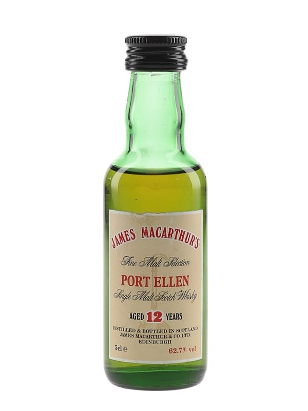 A miniature bottle of Port Ellen 12 Year Old Fine Malt Selection Single Malt Scotch Whisky, bottled at 62.7% ABV by James MacArthur's.