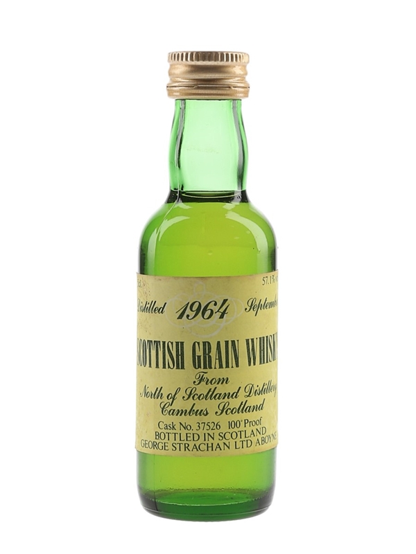 A miniature bottle of Scottish Single Grain Whisky distilled in September 1964 at North of Scotland Distillery, Cambus. This was bottled at 57.1% ABV by George Strachan Ltd.