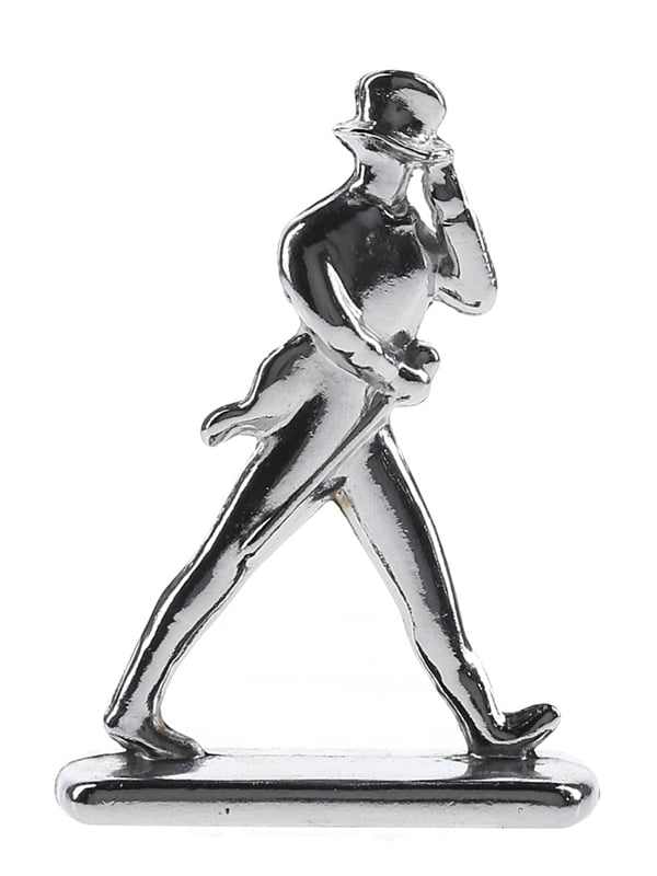 A stainless steel, silver-coloured Johnnie Walker Striding Man. This is approximately 8.5cm tall and 6cm across.