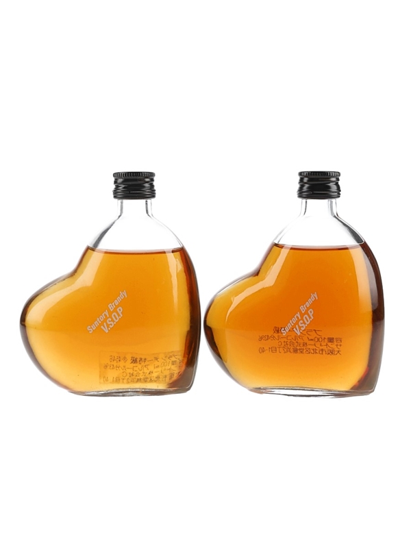 This lot contains two miniature bottles of Suntory VSOP brandy presented in a heart shaped glass bottle.