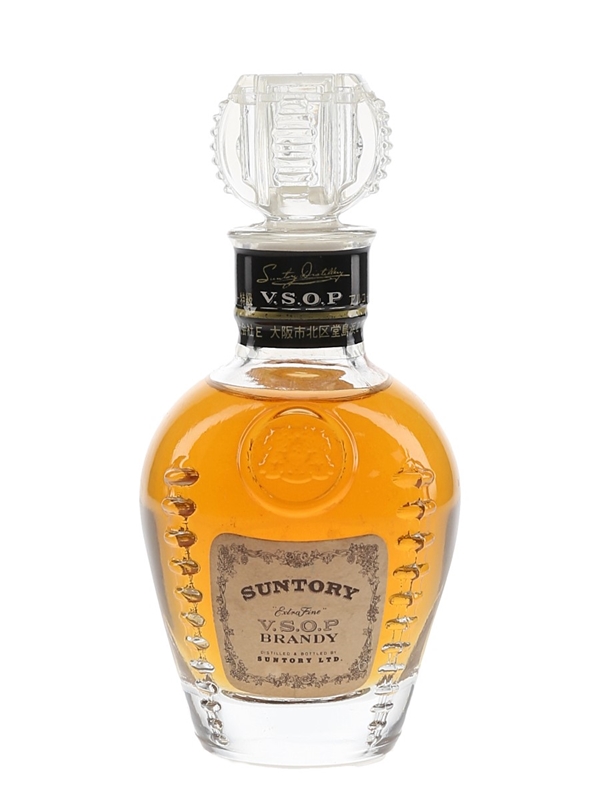 A miniature bottle of Suntory VSOP brandy presented in a glass decanter.