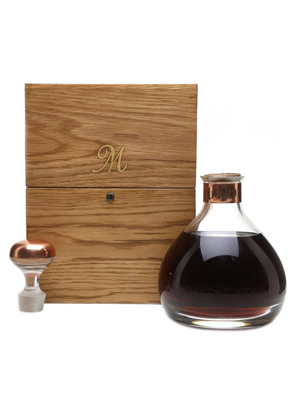 The Macallan 50 Year Old Millennium decanter. This was distilled in January 1949 and bottled in August 1999. Presented in a Caithness Glass decanter with stopper, inside an oak presentation case with key.