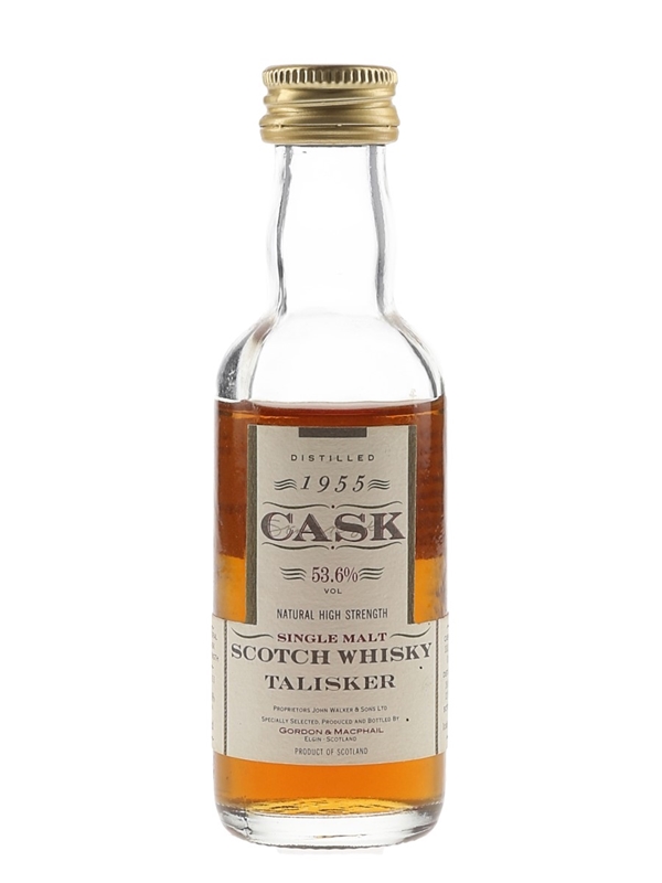 A miniature bottle of Talisker, distilled on 12 and 28 May 1955, and bottled in October 1993 by Gordon & MacPhail as part of their Cask Strength series.