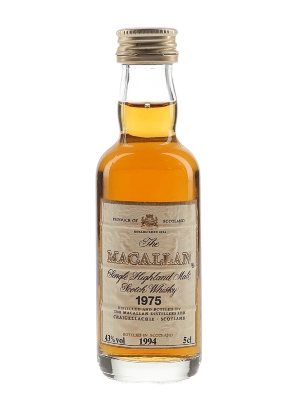 A miniature bottle of The Macallan 1975 Single Highland Malt Scotch Whisky. This was distilled in 1975 and bottled in 1994 at 43% ABV.