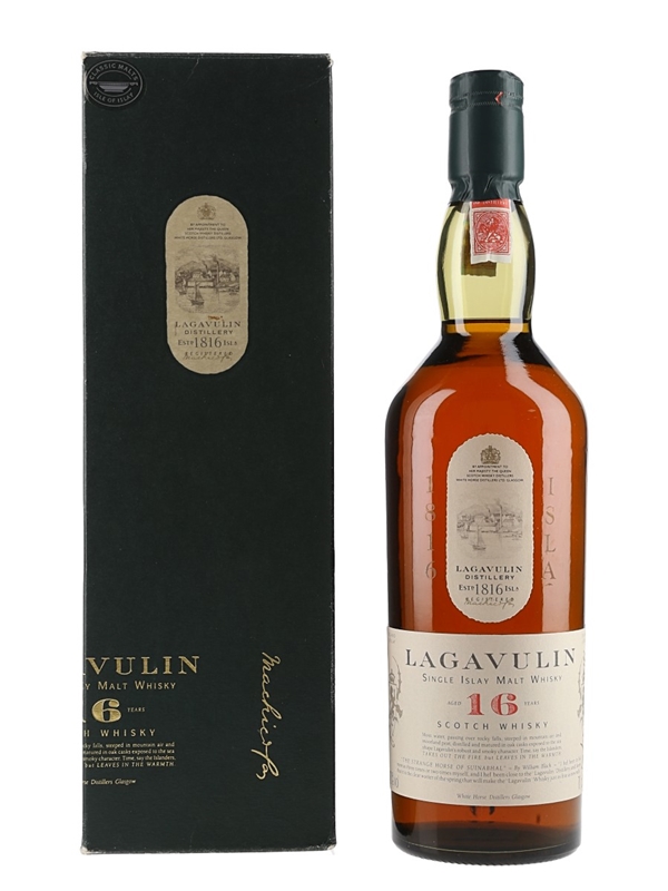 A bottle of Lagavulin 16 Year Old Islay Single Malt Scotch Whisky, part of Diageo's Classic Malts of Scotland range. We estimate this was bottled in the 1990s, when the distillery was owned by White Horse Distillers.