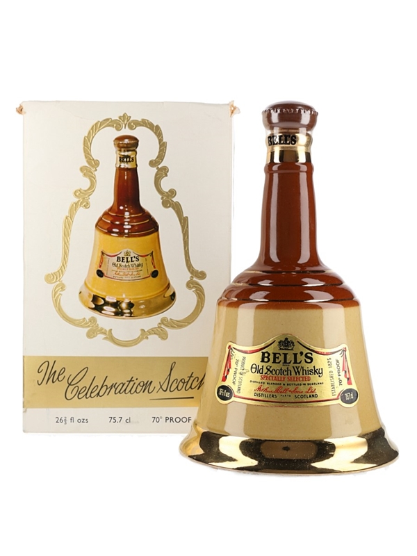 A bottle of Bell's Specially Selected Old Scotch Whisky presented in a brown ceramic decanter. This preceded the Christmas series and is of a slightly narrower shape than later editions. We estimate this was bottled in the 1970s.