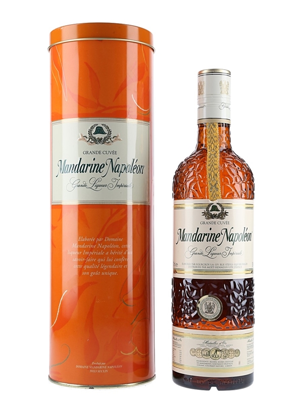 A litre bottle of Mandarine Napoleon Grande Liqueur Impériale produced in Belgium. This liqueur is created by blending macerated oranges, 10 year old Cognac and a range of botanicals.