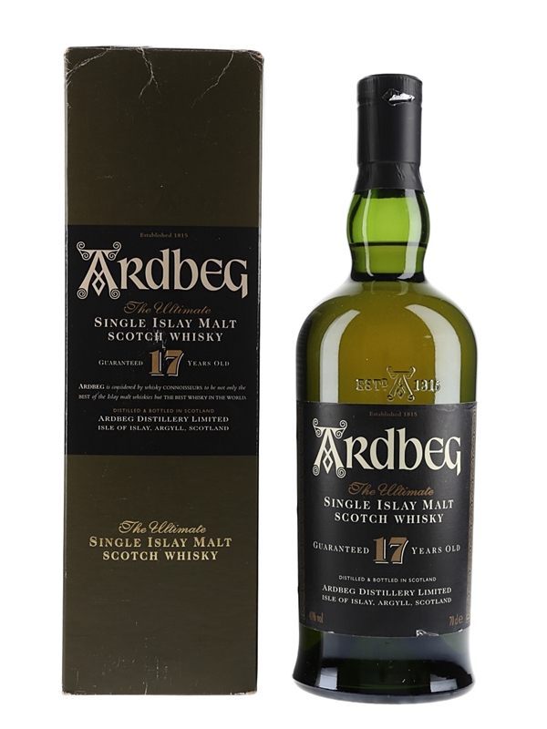 A bottle of the Ardbeg 17 Year Old The Ultimate Single Islay Malt Scotch Whisky. We estimate this was bottled in the 1990s.